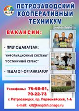 Петрозаводский кооперативный техникум приглашает на работу педагога-организатора и дипломированных специалистов по "Гостиничному сервису", "Земельно-имущественным отношениям", "Информационным системам" .