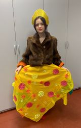 Авторы костюма решили создать несколько сказочный образ и назвали его «Царица Морошка». Переливающийся позолоченный кокошник, натуральная шубка с оранжевыми отворотами и многослойная юбка с ягодками в действительности позволили окунуться в мир волшебства и сказки. Дополнил образ макияж в оранжево-красных тонах и приветливые веснушки на щечках модели, в роли которой выступила Потахина Валерия.