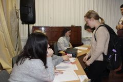 После того, как кандидаты представились, начала работу избирательная комиссия в лице Тарасовой Екатерины, Мухиной Яны и Дробышевской Дианы - студенток 1 курса (куратор – Мартынов С.А.). Девушки регистрировали участников голосования, в свою очередь избиратели оставляли голос за понравившегося кандидата.