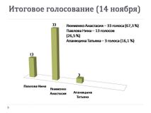 По итогу голосования места распределились следующим образом. Апаницина Татьяна набрала 3 голоса. Павлова Нина – 13 голосов. Якименко Анастасия – 33 голоса.