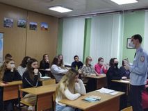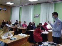 Борис Андреевич рассказал студентам о дорожно-транспортных происшествиях с пешеходами, какие ошибки допускают водители и пешеходы, что виляет на реакцию водителя, как быстро может остановиться автомобиль, про световозвращающие элементы, как правильно выбрать место для перехода дороги.
